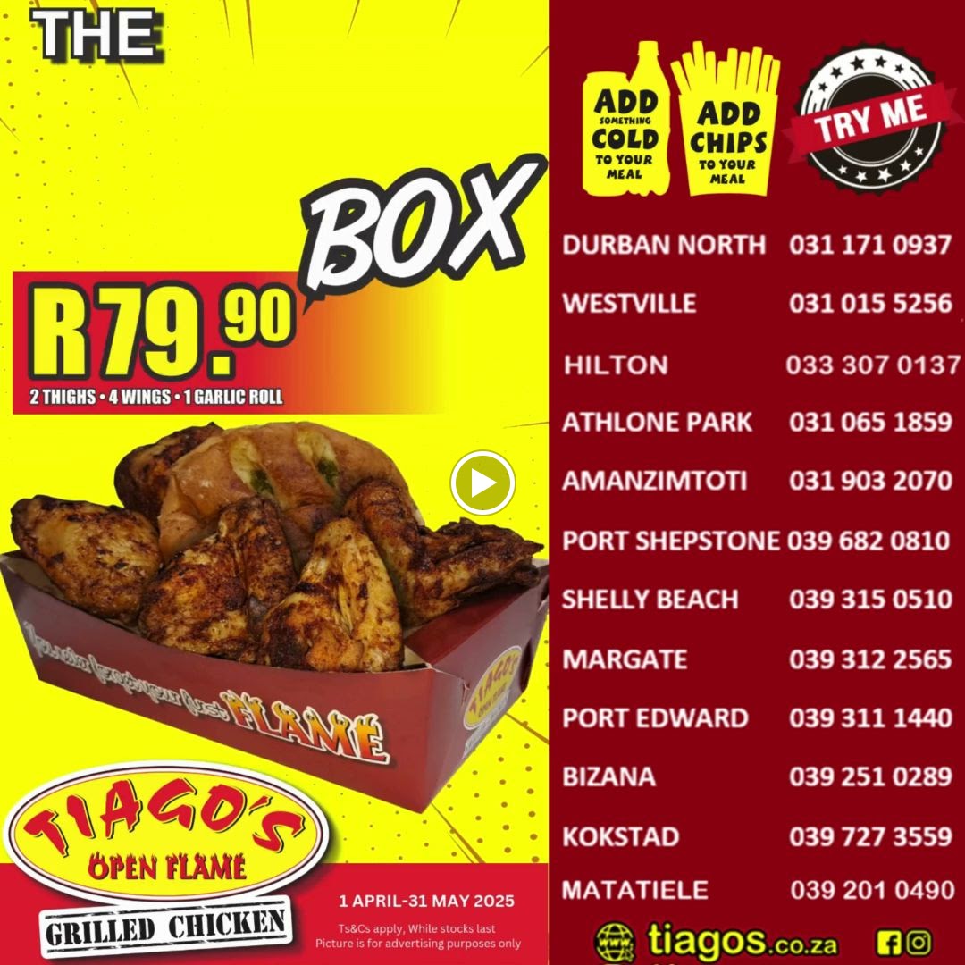 Welcome to Tiago's Port Shepstone, your go-to destination for delicious Halaal meals in the heart of Port Shepstone. Tucked away in the Harbourview Centre, this gem serves up an enticing array of dishes, with the highlight being their Jumbo Chicken Burger paired with crispy chips. As noted by satisfied customers, the generous portions and affordable prices make it a local favorite.